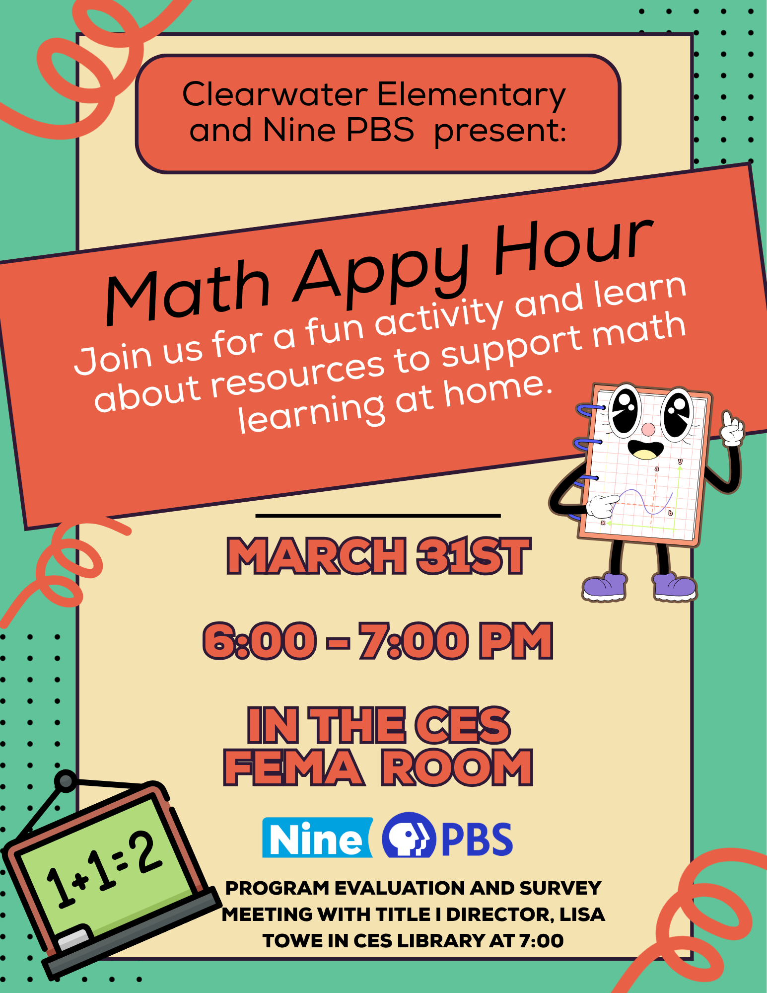 Elementary students and their parent/guardian are invited to "Math Appy Hour" on March 31st from 6:00-7:00 in the Clearwater Elementary FEMA room. Join us for a fun activity and learn about resourc...